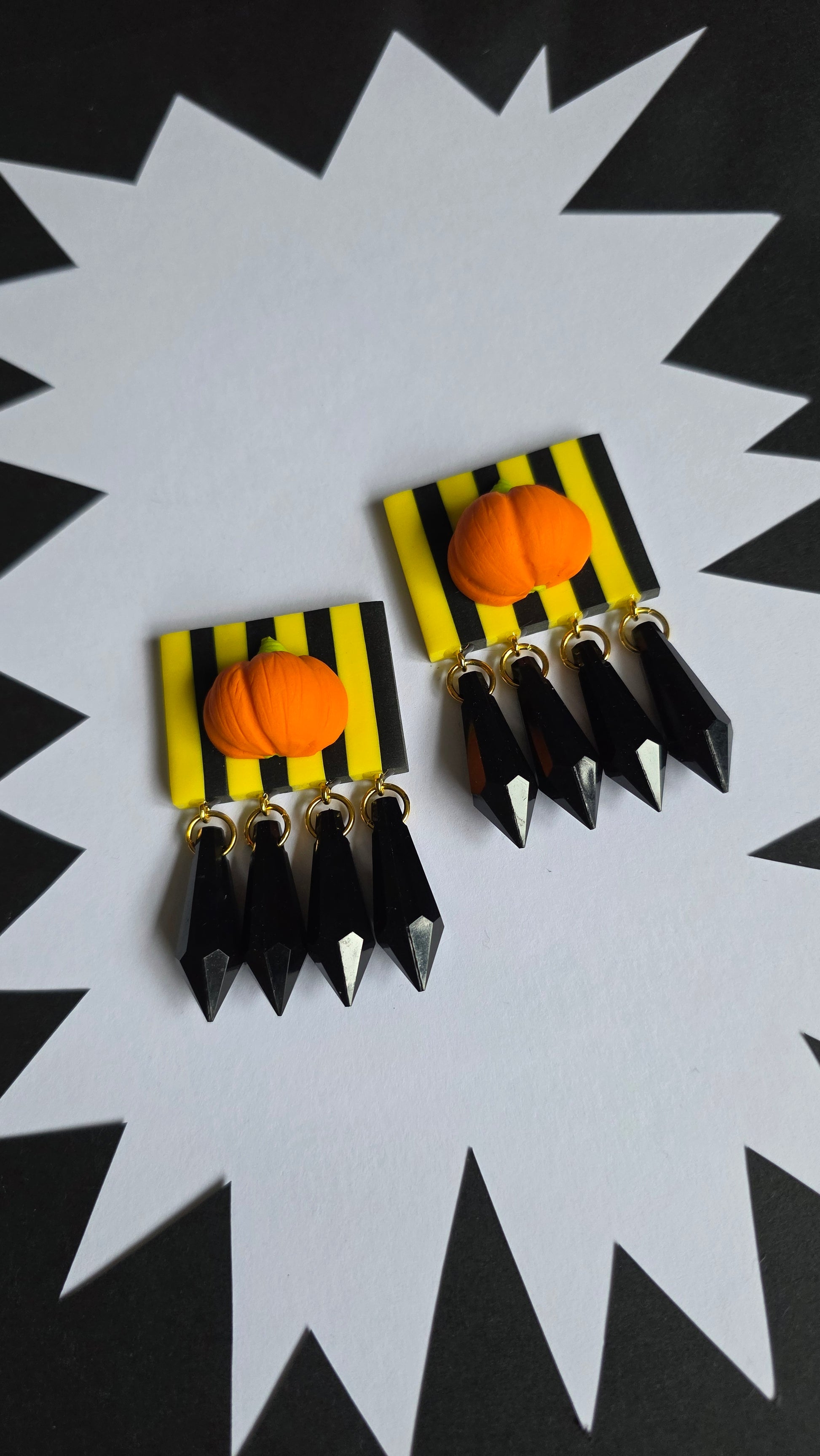 Black/yellow striped slab with pumpkin detail and black crystal drops